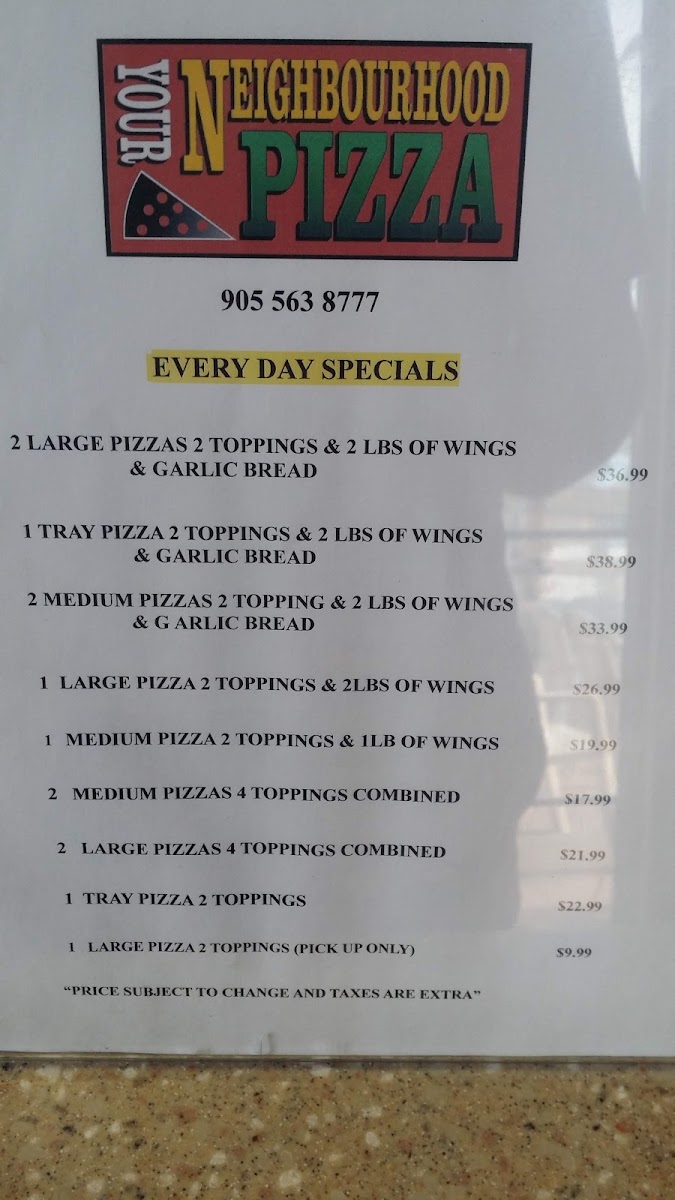The menu at Your Neighbourhood Pizza Company in Beamsville offers a variety of delicious dishes, perfect for any craving. For those looking to feed a crowd, their Feed 4 For $40 special on Tuesdays is a great deal. The Pizza & Wing Combos offer options like a Medium Pizza with 2 Toppings plus 1 lb Wings or a Large Pizza with 2 Toppings and 2 lbs Wings. The Pickup Specials feature affordable choices like a Large Pizza with 2 Toppings for a quick pick-up. For larger gatherings, the 2 Topping Specials with 2 Medium Pizzas or 2 Large Pizzas are ideal. The menu also includes a variety of appetizers like Party Platter, Spinach & Artichoke Dip, and Meatballs Marinara. Flatbreads, such as the Buffalo Chicken Flatbread and Pulled Pork Flatbread, make for excellent shareables. In addition, their fresh salads like the Neighbourhood Cobb Salad and Grilled Chicken Caesar Salad cater to lighter tastes. For heartier meals, there are classic entrees like the Full Rack of Ribs and Homemade Meatloaf, as well as pasta dishes like Chicken Carbonara and Shrimp & Sausage Scampi. The sandwich and wrap section features favorites like the Classic Cuban & Fries and Buffalo Chicken Wrap & Fries. Their burger selection is equally tempting, with choices like the 8oz Neighbourhood Burger and the 8oz Texas Cheese Burger. For pizza lovers, the restaurant offers the Build Your Own Pizza with options ranging from Small to Tray size, as well as Signature Pizzas like Butter Chicken Pizza and Philly Cheese Steak Pizza. No meal is complete without dessert, with options such as the Reese’s Chocolate Blondie and Tiramisu. And for drinks, they offer a selection of sodas and bottled water to accompany your meal.